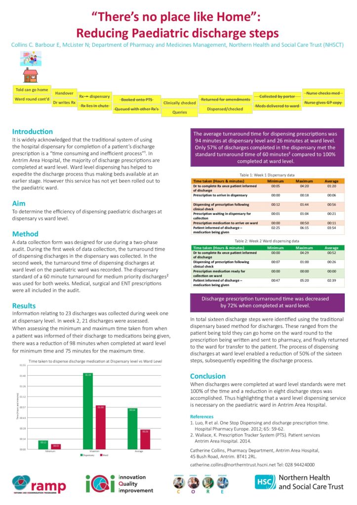 It is widely acknowledged that the traditional system of using the hospital dispensary for completion of a patient’s discharge prescription is a “time consuming and inefficient process”. In Antrim Area Hospital, the majority of discharge prescriptions are completed at ward level. Ward level dispensing has helped to expedite the discharge process thus making beds available at an earlier stage. Discharge prescription turnaround time was decreased by 72% when completed at ward level. Only 57% of discharges completed in the dispensary met a standard turnaround time of 60 minutes compared to 100% completed at ward level.